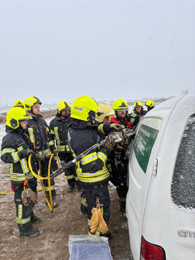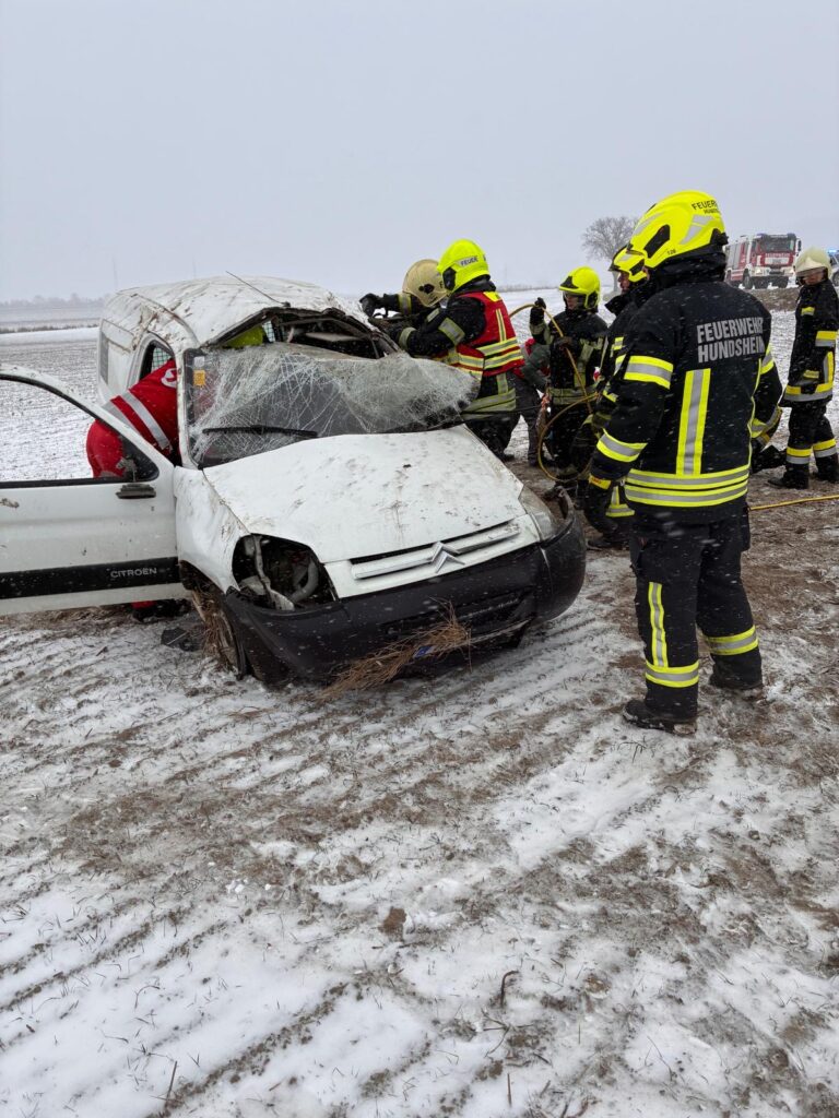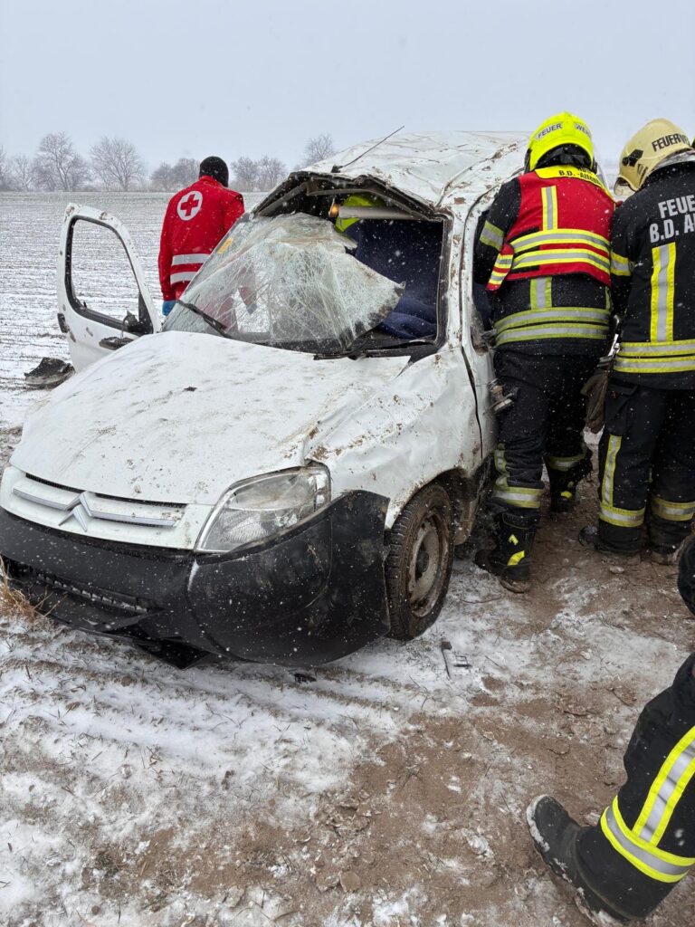 Beim Eintreffen am Einsatzort fanden wir einen PKW vor, der bei winterlichen Fahrverhältnissen und glatter Fahrbahn von der Fahrbahn abkam und nach Überschlag im angrenzenden Feld zum stehen kam. Eine verletze Person wurde bereits außerhalb des Fahrzeugs betreut, die verletze Lenkerin war noch im Fahrzeug eingeschlossen. Mit dem hydraulischen Rettungssatz vom SRF der FF-Bad Deutsch Altenburg wurde die Fahrertüre geöffnet, und die Lenkerin in Absprache mit dem Rettungsdienst aus dem Fahrzeug befreit.