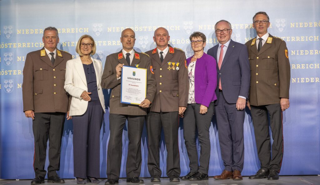 Am Donnerstag den 23.04.2026 wurde Kommandant Andreas Gumprecht-Adam, Kommandantstellvertreter Thomas Kammlander und Geschäftsführende Gemeinderätin Annemarie Leidner im NÖ Feuerwehr und Sicherheitszentrum Tulln in Beisein des Landesfeuerwehrkommandanten und dessen Stellvertreter von Landeshauptfrau Johanna Mikl-Leitner und LH-Stellvertreter Stephan Pernkopf die Jubiläumsurkunde anlässlich des 150-jährigen Bestehens der Freiwilligen Feuerwehr Hundsheim überreicht! (Foto: Matthias Fischer / NÖ LFKDO)